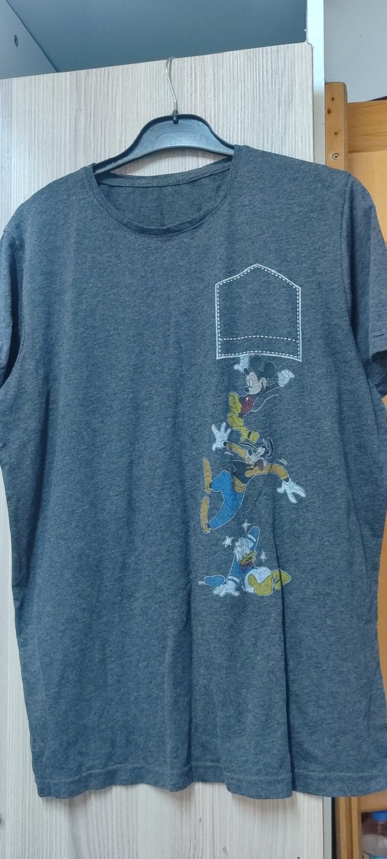 Gri denim kumaş, kısa kollu, yuvarlak yaka ve bol kesim hamile tişörtü. Üzerinde çizgi film karakterleri baskısı ve düğme detayı bulunur.