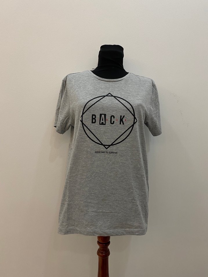 Gri renkli, baskılı hamile tişörtü, yuvarlak yaka ve kısa kolludur. Pamuk kumaştan, rahat kesimli, günlük kullanıma uygundur. 'BACK' yazılı tasarıma sahiptir.