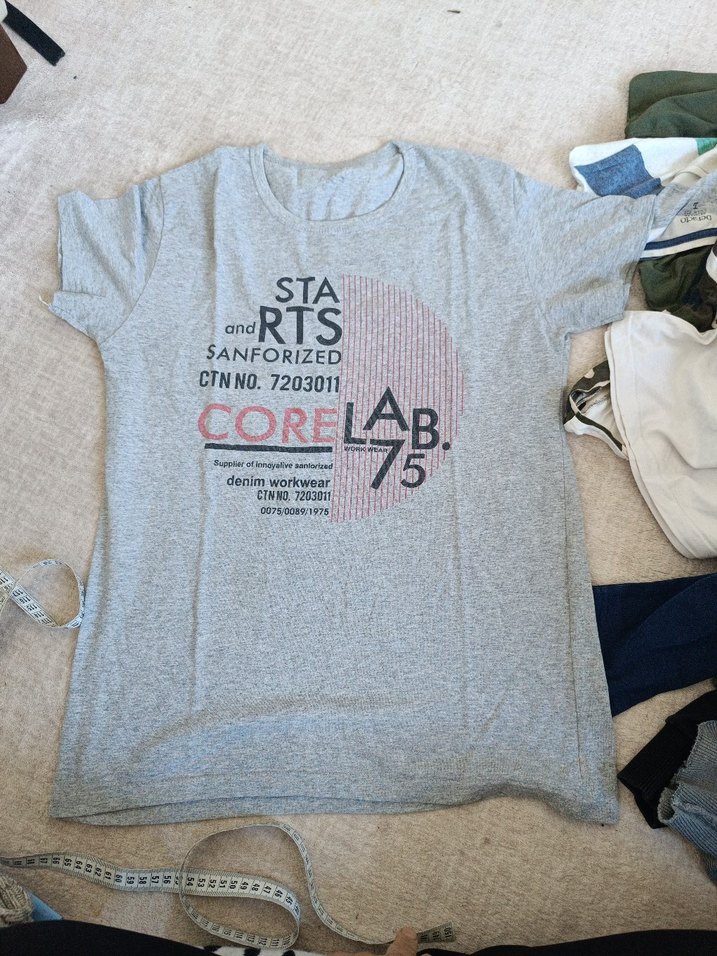 Gri pamuklu kumaştan, kısa kollu ve yuvarlak yakalı bol kesim hamile tişörtü. Üzerinde baskı deseni bulunur, günlük rahat stil için uygundur.