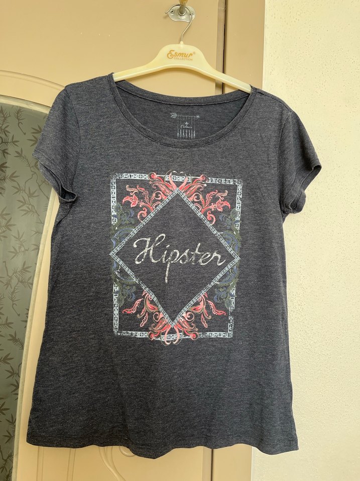 Gri renkte, kısa kollu ve yuvarlak yakalı tişört. Pamuklu kumaştan, bol kesimli ve baskılı desene sahip. Günlük kullanım için rahat bohem tarzda.