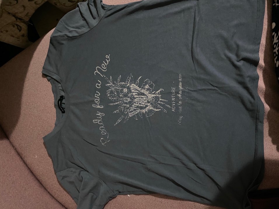Gri baskılı hamile tişörtü, kısa kollu ve yuvarlak yakalıdır. Pamuklu, bol kesim ve normal midi uzunlukta, gündelik kullanıma uygundur.