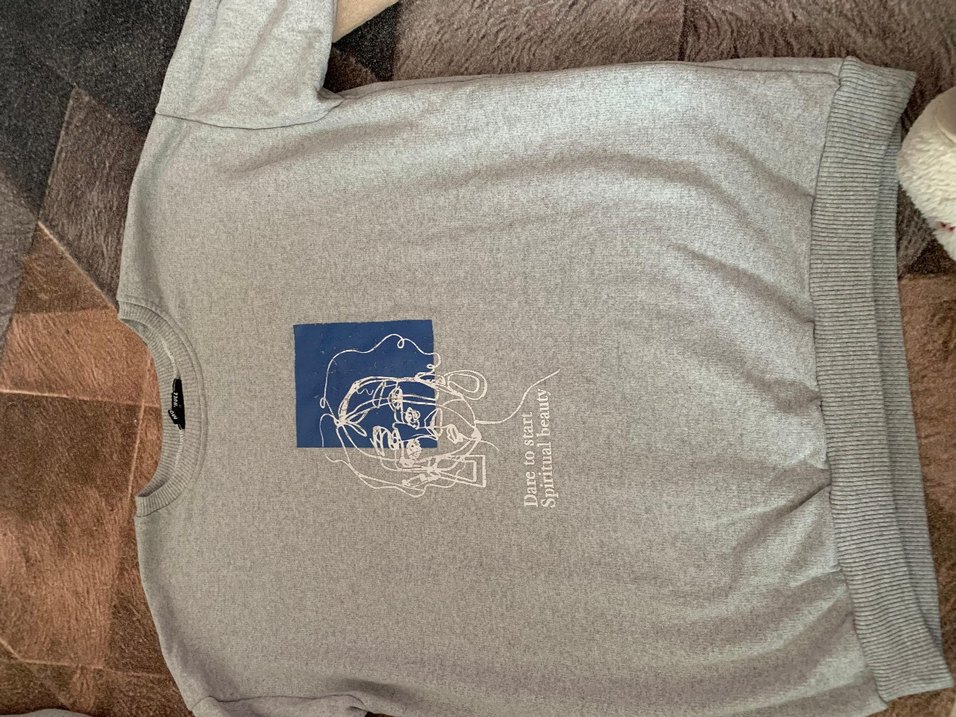 Yumuşak keten kumaştan yapılmış, kısa kollu, yuvarlak yakalı gri hamile tişörtü. Baskılı soyut yüz deseni ve yazı içerir, salaş kesim, günlük sokak stili için uygun.