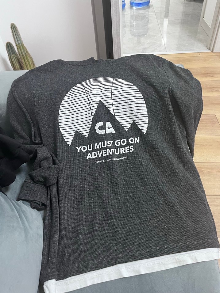 Pamuk kumaştan, gri renkli, uzun kollu, bisiklet yaka hamile tişörtü. Üzerinde 'YOU MUST GO ON ADVENTURES' yazılı baskı bulunur. Rahat ve bol kesimdir.