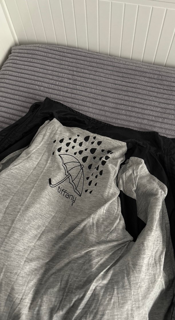Gri renkte, şemsiye ve damla baskılı, uzun kollu, yuvarlak yakalı, bol kesim hamile tişörtü. Fermuarlı detaylara sahip, rahat dış mekan kullanımı için uygundur. ☔
