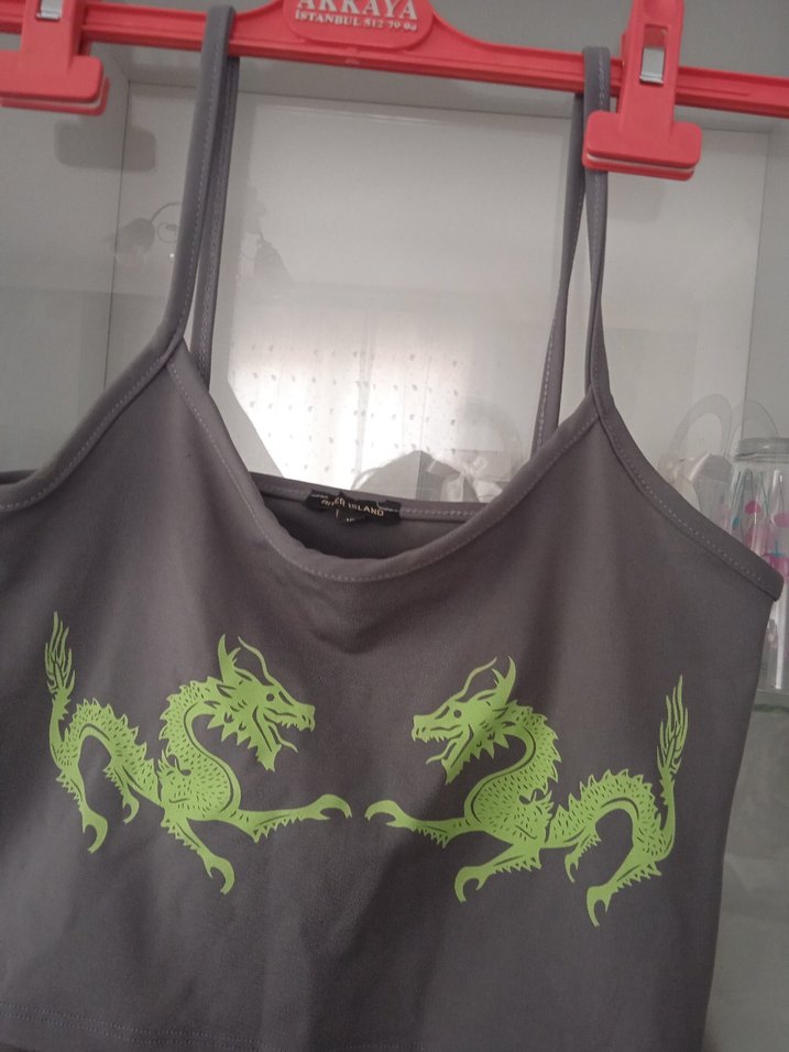 Gri renkli, yeşil ejderha baskılı, ince askılı ve vücuda oturan atlet. Yumuşak dokulu kumaştan üretilmiştir.