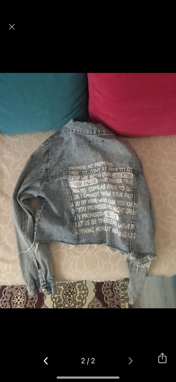 Gri renkli, uzun kollu ve baskılı yazılar içeren bol kesim kadın denim ceket. Düğmeli ön ve straplez yaka detayı bulunur, günlük kullanıma uygundur.