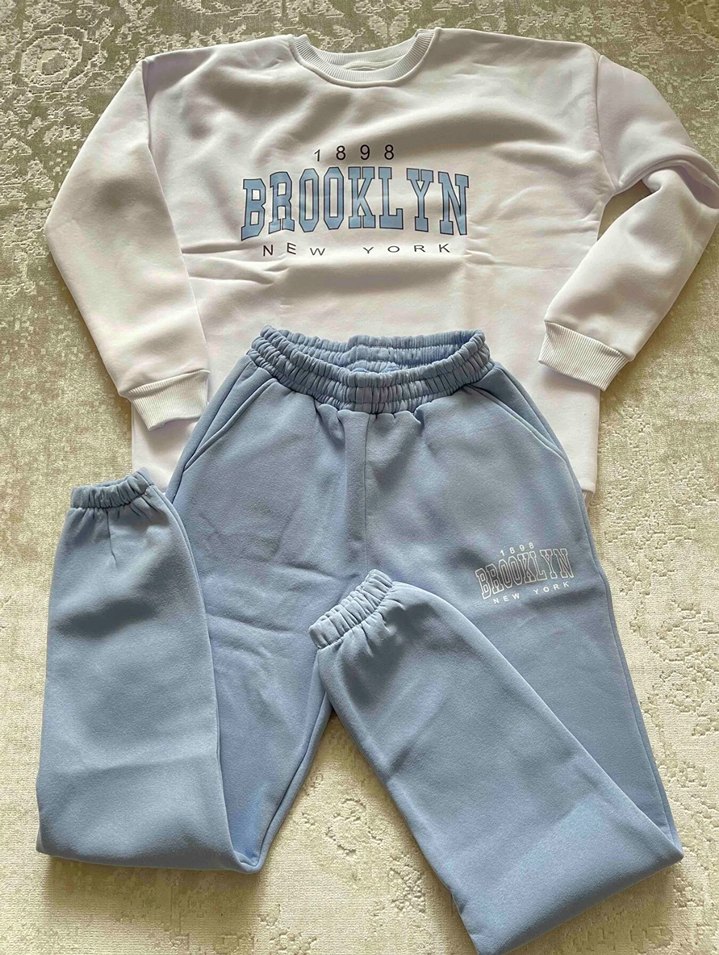 Gri Baskılı Kadın Denim Eşofman Takımı üst ve alt