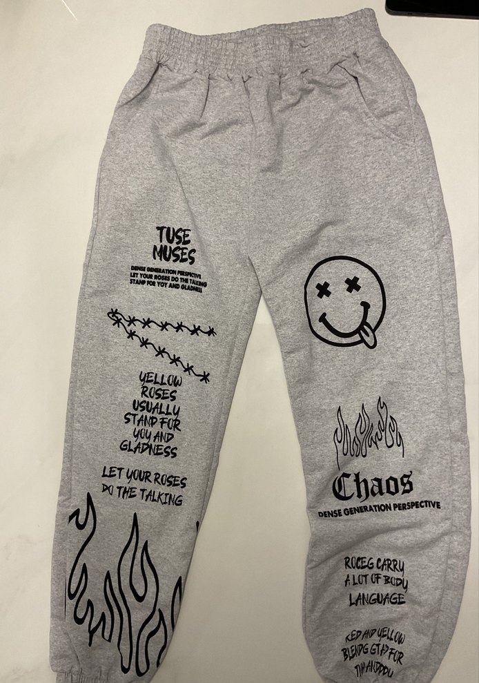 Yumuşak kumaştan gri, bol kesim kadın eşofman altı. Siyah baskılı desenler ve yazılarla süslenmiş, midi boy ve lastikli bel detaylıdır.