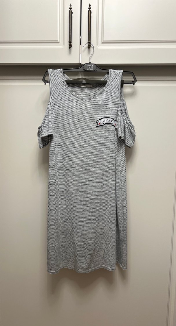 Gri renkli, pamuklu kumaştan üretilmiş, bol kesim ve omuzları açık detaylı baskılı günlük elbise.DF Young marka M beden #M #Mbeden #DFYoung #elbise #gri