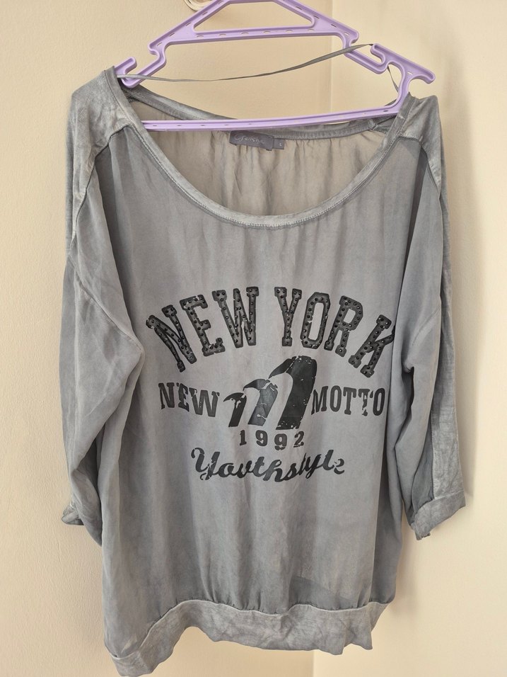 Gri keten kumaştan, salaş kesim ve uzun kollu kadın gömlek. Önünde 'NEW YORK' ve '1992' baskıları bulunur, kemer detayı içerir. Sokak stiline uygun.
