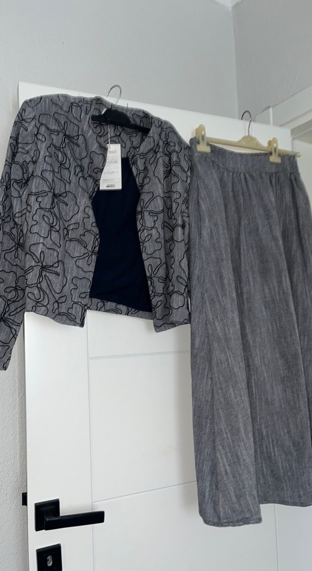 Kadın keten takımı, uzun boy, regular fit. Ceket baskılı, yaka detaylı ve uzun kollu, etek pilili, gri renkli, günlük sokak stili için uygundur.
