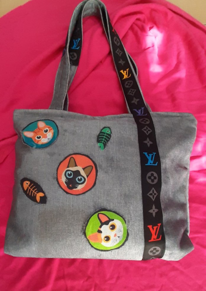 Gri sentetik kumaştan, renkli baskılı patch detaylı ve fermuarlı kadın omuz çantası. Sokak stiline uygun, günlük kullanım için ideal.