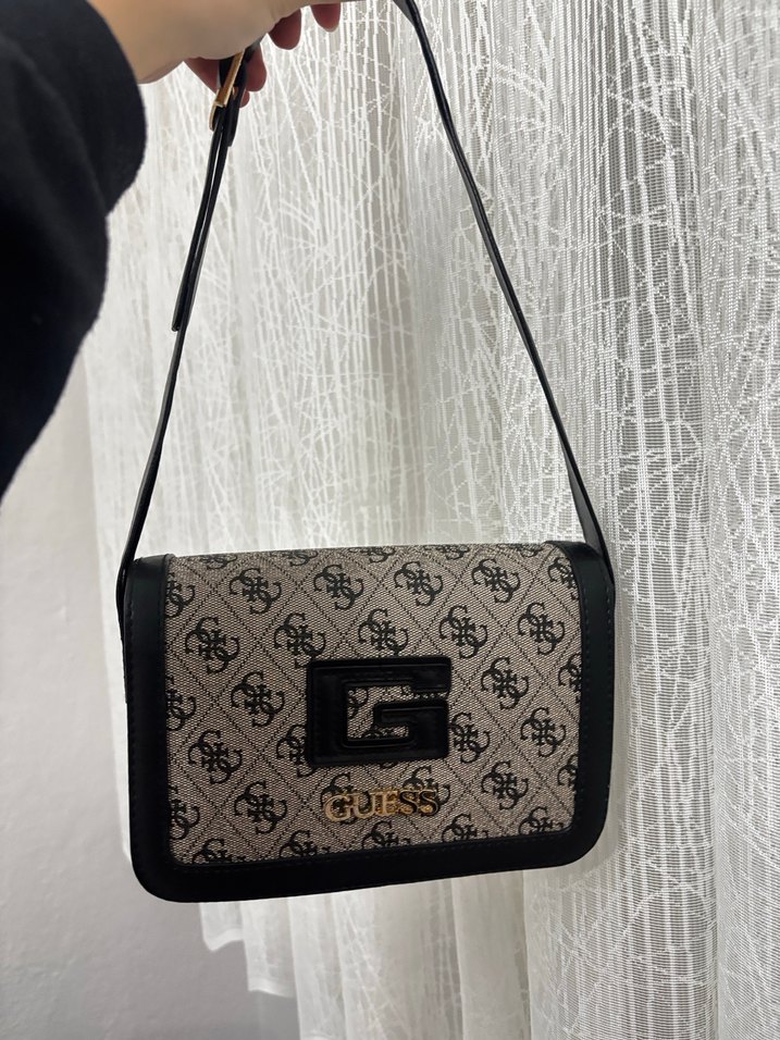 Gri baskılı, tokalı kapaklı ve sentetik kumaştan yapılmış kadın çantası. COESS logosu bulunur, günlük kullanıma uygundur.