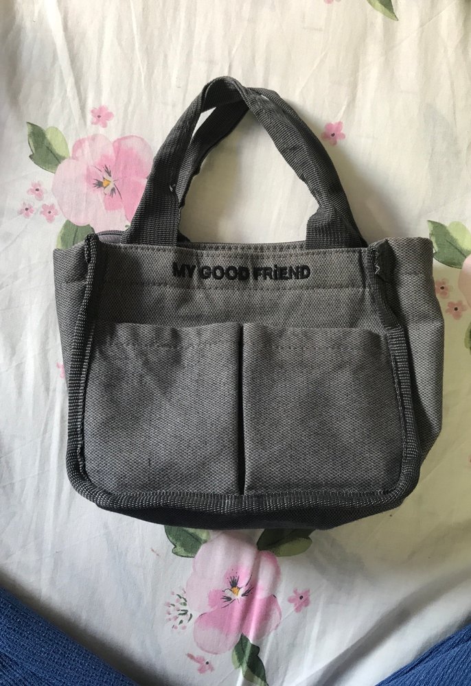 Gri renkte pamuk kumaştan yapılmış, "MY GOOD FRIEND" baskılı, fermuarlı ve önünde iki cepli çanta. Sokak stiline uygun.