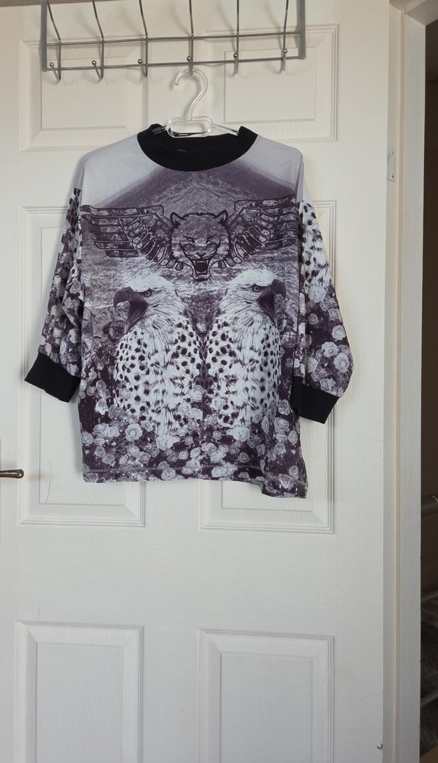 Gri baskılı, uzun kollu, bisiklet yaka, bol kesim kadın sweatshirt. Örme kumaştan, günlük kullanıma uygun.
