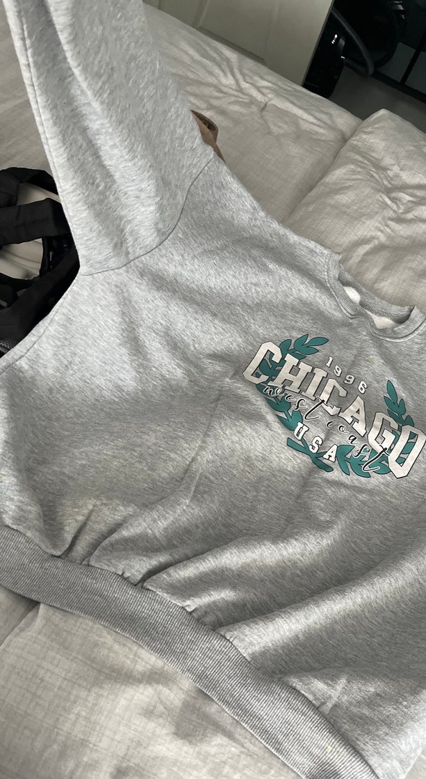 Pamuk kumaştan, baskılı ve fermuarlı detaylara sahip gri kadın sweatshirt, yuvarlak yakalı ve bol kesimdir. Sokak stiline uygun uzun kollu tasarım.