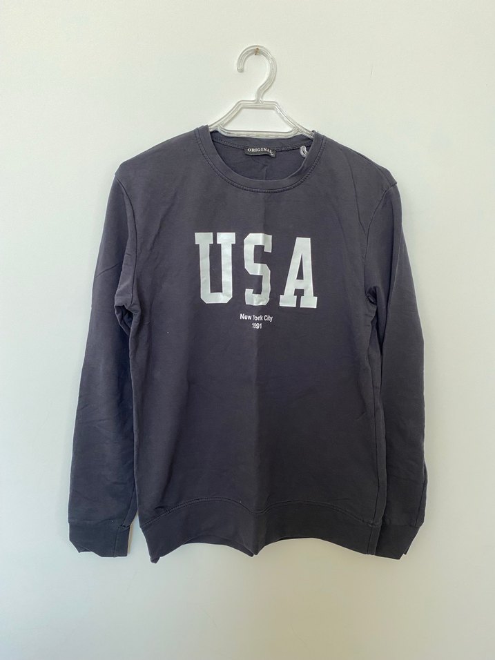 Gri, uzun kollu, yuvarlak yakalı, baskılı USA detaylı, bol kesim kadın sweatshirt. Denim kumaştan üretilmiştir, rahat sokak stili için uygundur.
