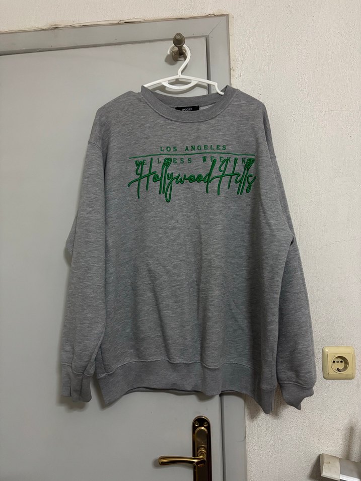 Gri renkli, uzun kollu ve bisiklet yaka kadın sweatshirtü. Yumuşak keten kumaştan, baskılı ve bol kesim, rahat sokak stili için ideal.