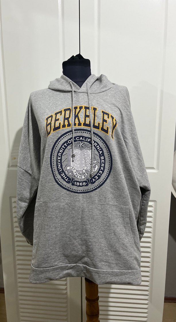 Gri renkli, Berkeley baskılı kadın sweatshirt, yuvarlak yaka ve uzun kolludur. Bol kesim, yumuşak ve sıcak kumaştan yapılmıştır. Midi boyda ve spor aktiviteler için uygundur. Temiz defosuz oversize sweet. L-XL