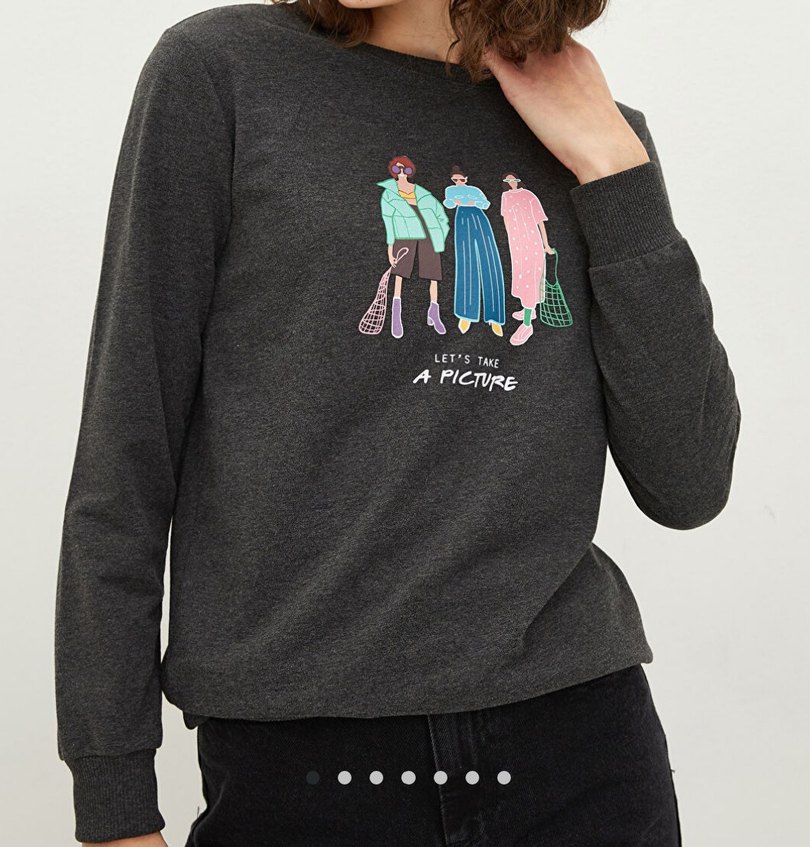 Gri renkli, baskılı ve örgü yapısında kadın sweatshirtü. Rahat kesim, yuvarlak yaka ve uzun kolludur. Sokak stiline uygun, yumuşak ve sıcak kumaş kullanılmıştır. Az kullanıldı, Herhangi bir kusuru yoktur M-L beden giyenlere rahatlıkla olur. İki kol arası 55 boyu ise 63 cm dir.