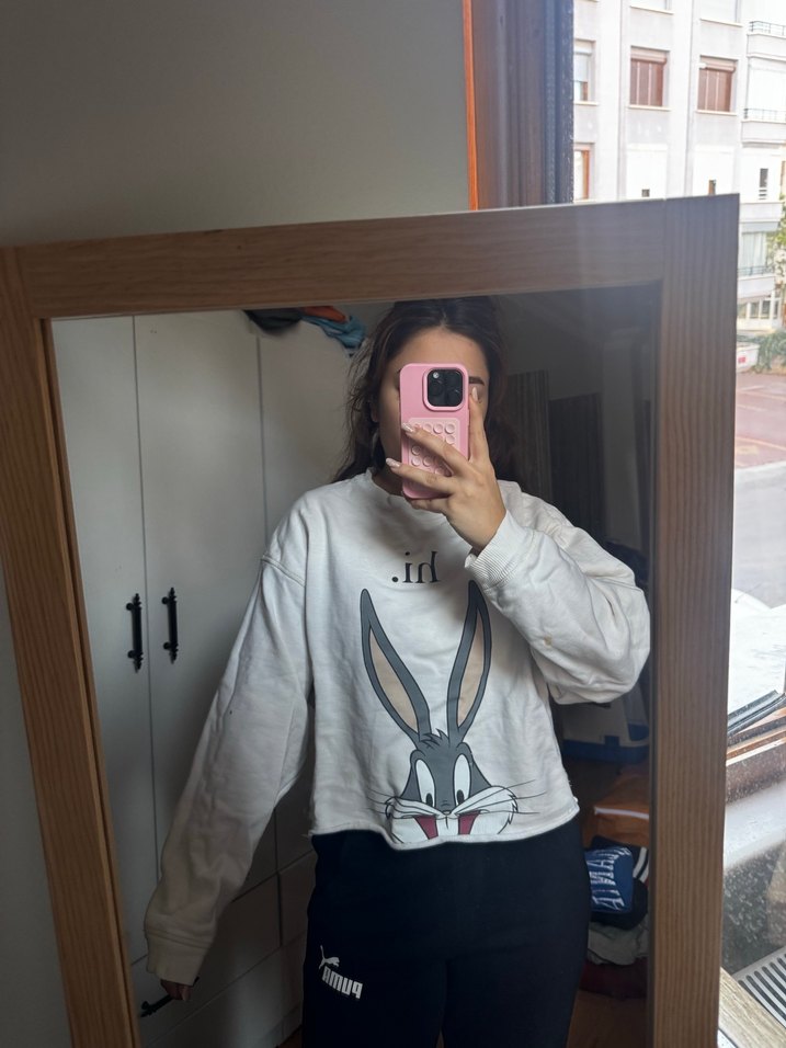 Gri renkli kadın sweatshirt, uzun balon kol ve Bugs Bunny baskısıyla. Yuvarlak yaka ve bol kesimli, yumuşak ve sıcak kumaştan üretilmiştir. Kollarında kusurlar görselde mevcuttur