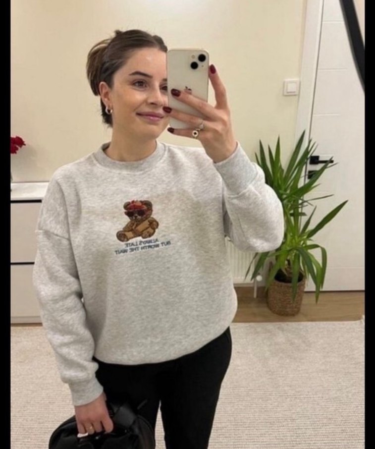 Gri renkli, yuvarlak yakalı ve uzun kollu sweatshirt, yumuşak ve sıcak kumaştan yapılmıştır. Rahat kesim ve kısa boy, sevimli baskılı ayıcık deseniyle gündelik kullanıma uygundur.