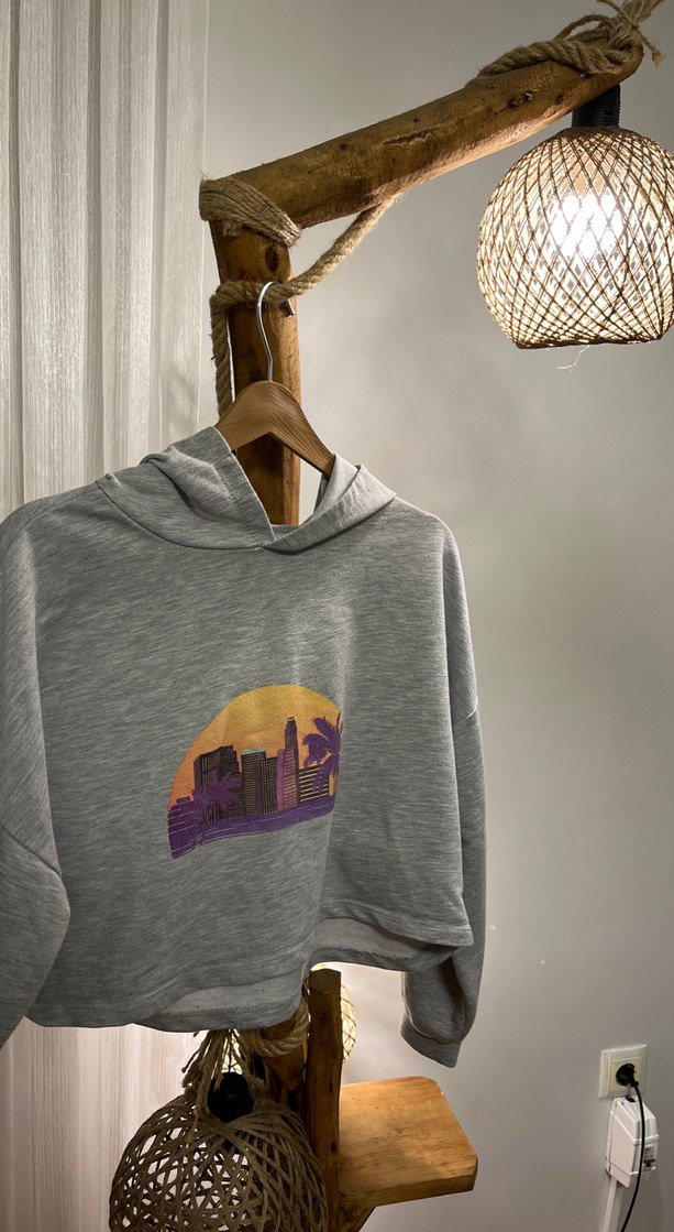 Gri, bol kesim, uzun kollu, bisiklet yaka sweatshirt. Önünde renkli baskı ve kısa boy tasarımıyla günlük sokak stili için uygun. ️