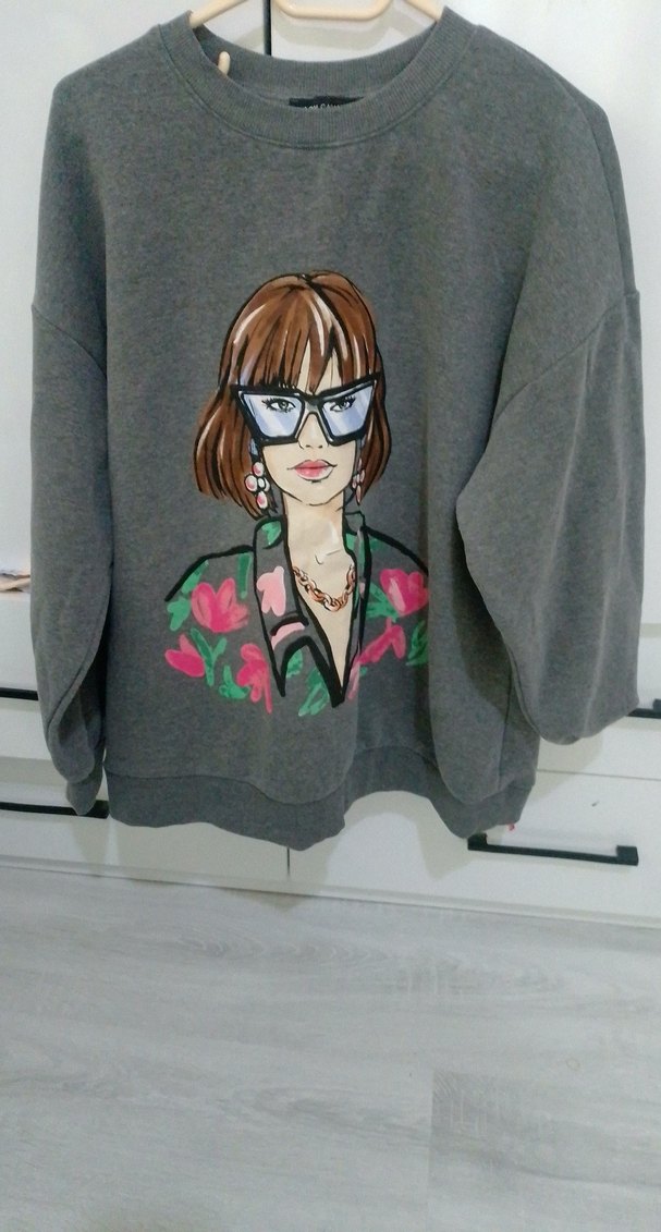 Gri renkli, uzun kollu, yuvarlak yaka ve bol kesim kadın sweatshirtü. yapılmış ve kadın figürlü baskı detayıyla dikkat çekiyor.