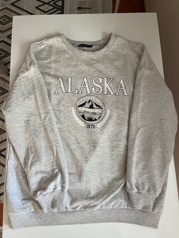 Gri, uzun kollu, bisiklet yaka ve "ALASKA 1975" baskılı kadın sweatshirt. Rahat kesim ve normal boyda, yumuşak ve sıcak kumaştan üretilmiştir. ❄️sıkıntısı yok l beden