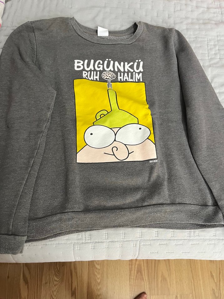 Gri renkli, yuvarlak yaka ve uzun kollu kadın sweatshirtü. Önünde "BUGÜNKÜ RUH HALİM" yazılı baskı ve toka detayı bulunur. Rahat ve günlük kullanıma uygundur.
