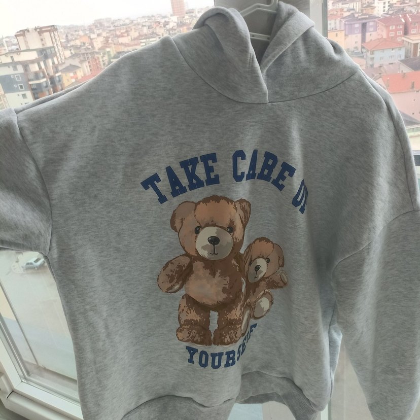 Gri renkli, yuvarlak yaka ve uzun kollu kadın sweatshirtü, baskılı ayıcık deseni ve 'TAKE CARE' yazısıyla. Yumuşak, örme kumaştan, bol kesim rahatlığı sunar.
