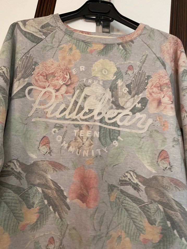 Gri taban üzerine çiçek ve kuş baskılı, pamuklu, uzun kollu, yuvarlak yaka, bol kesim sweatshirt. Günlük kullanım için uygundur.