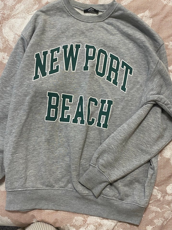 Gri renk, yuvarlak yakalı ve uzun kollu kadın sweatshirt. Önünde "NEWPORT BEACH" baskısı bulunur. Rahat kesim ve sıcak tutan kumaştan üretilmiştir.