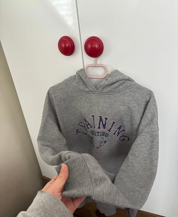 Gri renkli, kapüşonlu ve uzun kollu, bol kesim kadın sweatshirt . Üzerinde "TRAINING" yazılı baskı bulunur. Spor ve günlük stil için uygundur.