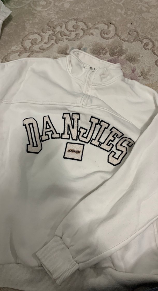Gri tonlarda, yumuşak sentetik kumaştan, uzun kollu, yüksek yakalı, önü yarım fermuarlı baskılı bol kesim kadın sweatshirtü. Ufak tefek lekeleri mevcut yıkanınca çıkabilir