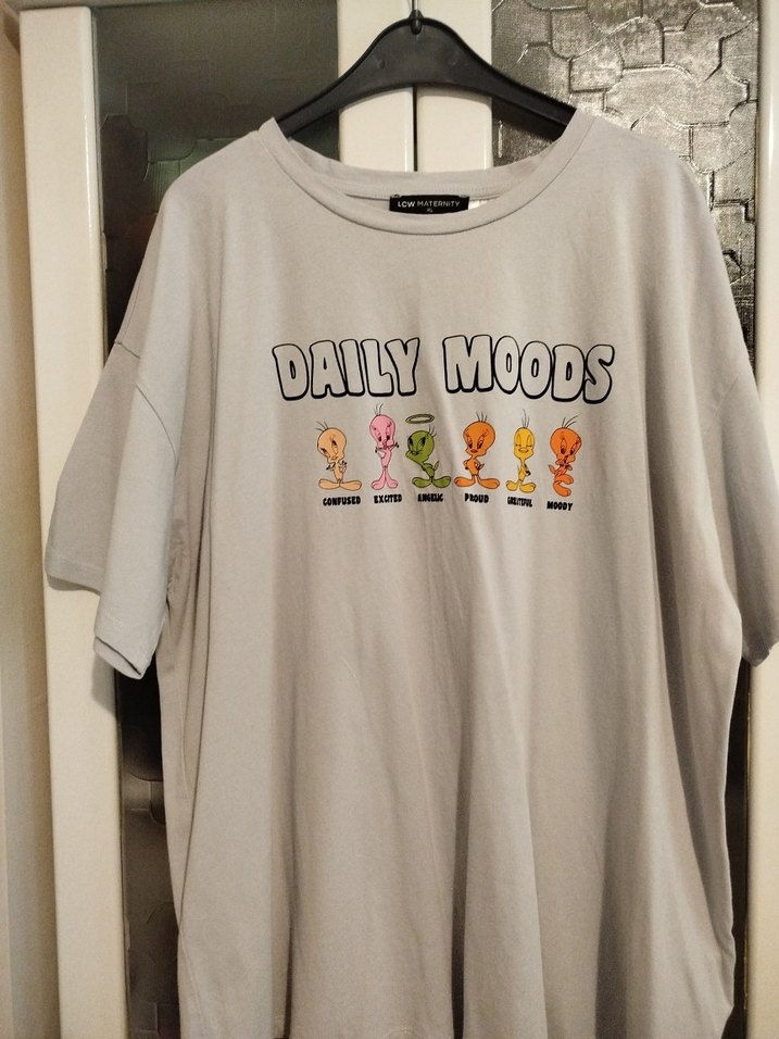 Pamuklu, gri, kısa kollu, bol kesim ve bisiklet yaka tişört. Üzerinde "DAILY MOODS" baskısı bulunan rahat ve şık bir günlük tişört.