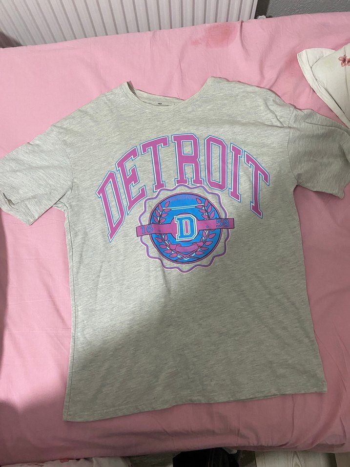 Pamuklu, kısa kollu ve bisiklet yaka gri tişört, önünde renkli Detroit baskısı bulunur. Günlük kullanım için rahat bir seçim.