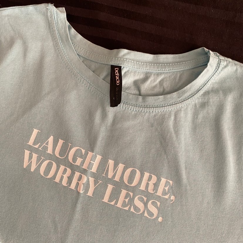 Pamuklu kumaştan, kısa kollu ve yuvarlak yakalı gri tişört. "LAUGH MORE, WORRY LESS." baskılı, günlük kullanıma uygun rahat kesim.