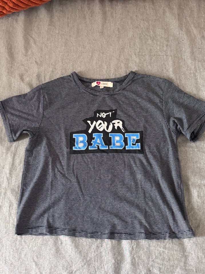 Gri renk, kısa kollu, yuvarlak yakalı ve bol kesim kadın tişörtü. Denim kumaştan, "NOT YOUR BABE" baskılı. Rahat ve şık sokak stili,