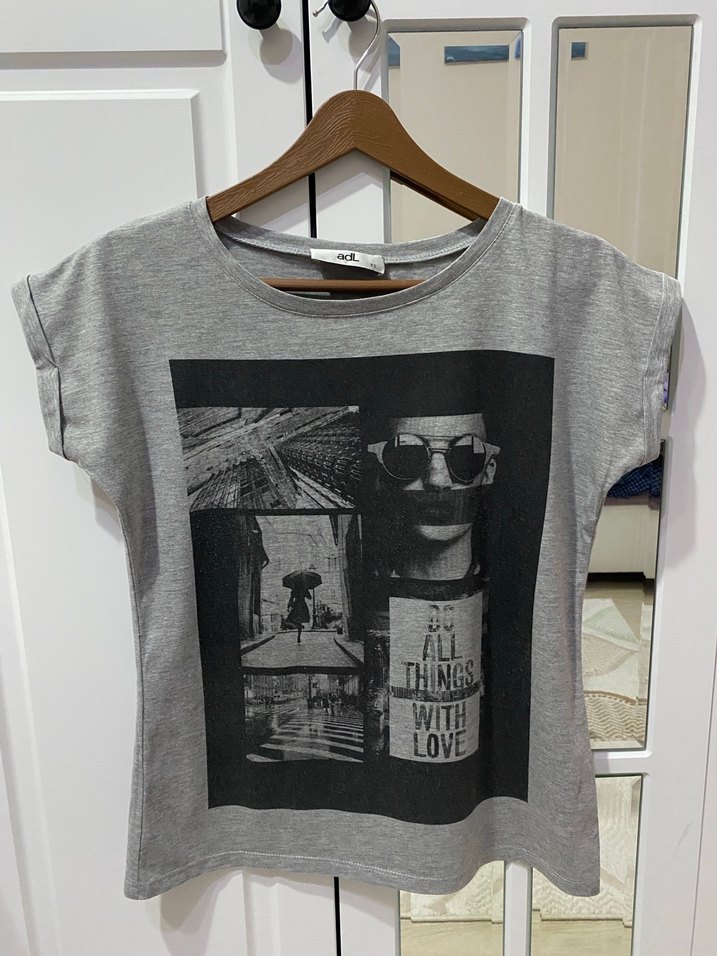 Gri/siyah kadın desenli tişört. Markası:adl, beden:xs Pamuklu, kısa kollu, bisiklet yaka, bol kesim gri kadın tişörtü. Siyah baskılı tasarım içerir. Günlük kullanıma uygundur.