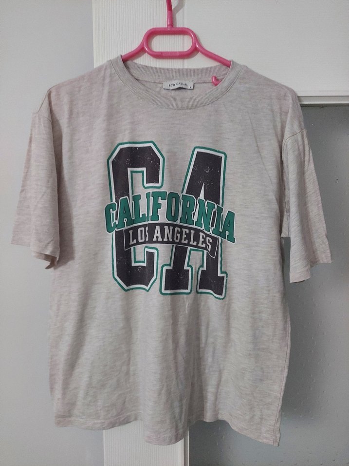 Bol kesim, pamuklu gri tişört, kısa kollu, baskılı California Los Angeles tasarımına sahip, bisiklet yaka, günlük sokak stili için uygun.