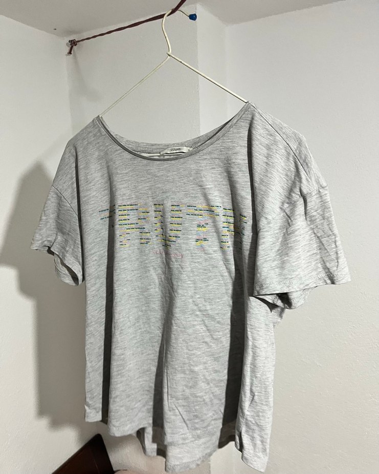 Gri renkli, yuvarlak yaka ve kısa kollu pamuklu kadın tişörtü. Rahat kesimi ve baskılı deseniyle günlük sokak stiline uygundur.