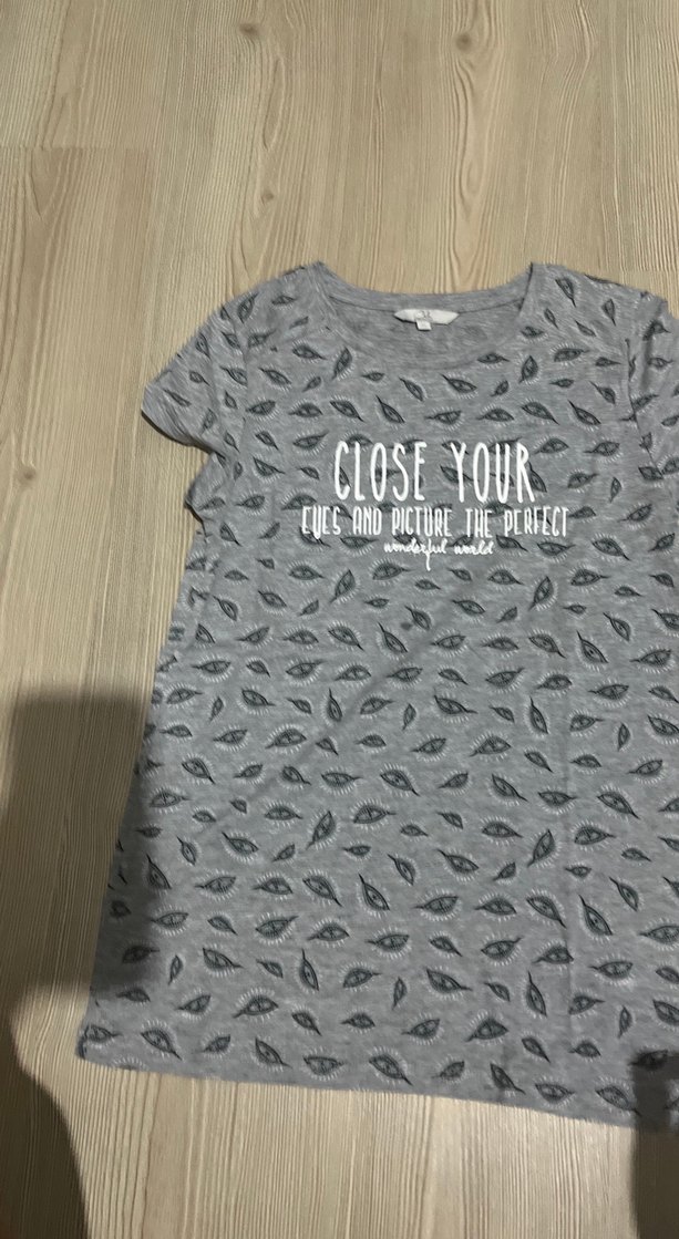 Gri pamuk tişört, kısa kollu ve rahat kesimdir. Üzerinde "CLOSE YOUR" yazılı baskılı desen vardır, günlük rahat stil için uygundur.