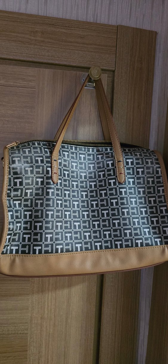 Gri baskılı desene sahip, kahverengi sentetik kumaş detaylı çağdaş kadın çantası. Fermuarlı kapanışı ile günlük ve iş kullanımına uygundur.