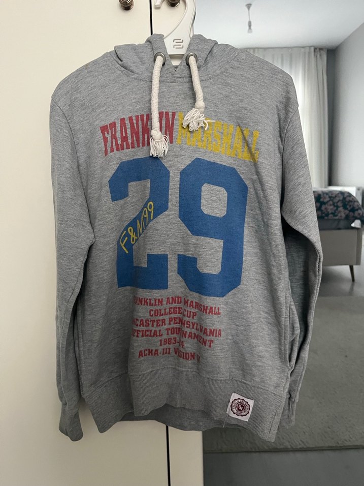 Gri renkli, baskılı ve kapüşonlu sweatshirt, rahat kesim ve uzun kolludur. Yumuşak örgü fleece kumaştan üretilmiş, spor ve günlük kullanım için uygundur.