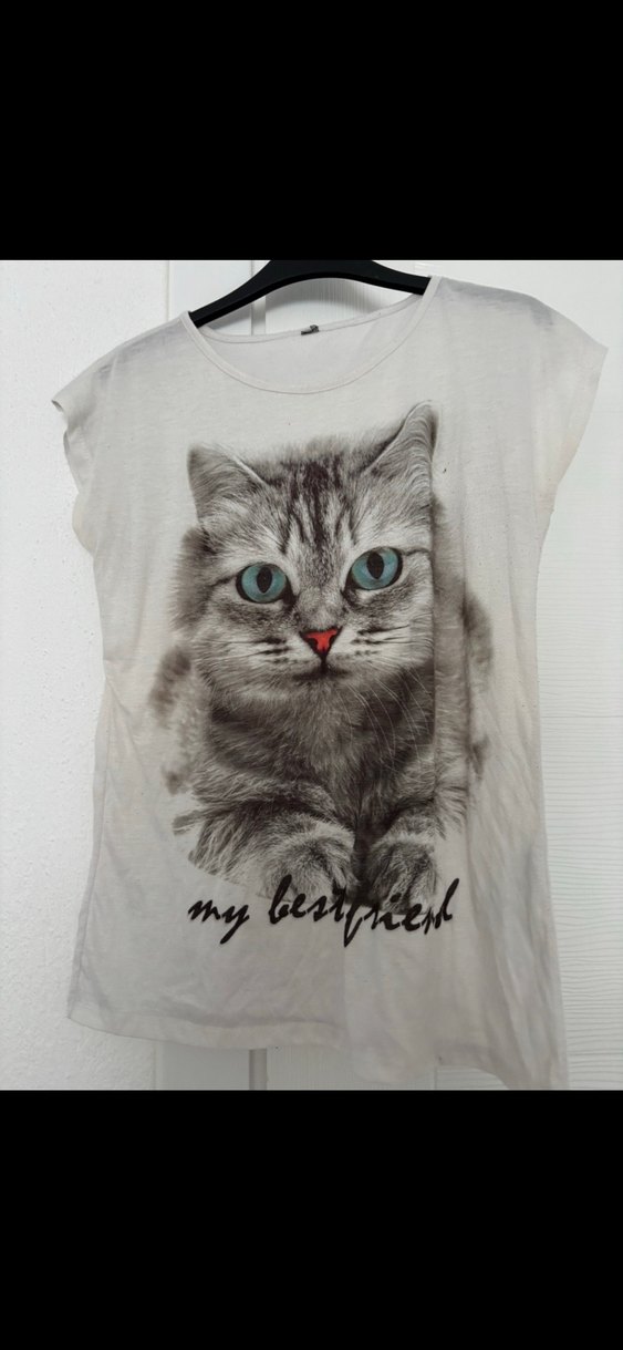 Gri sokak stili tişört, detaylı tüylerle büyük baskılı kedi ve mavi gözler içerir. Altında "my bestfriend" yazısı bulunur.