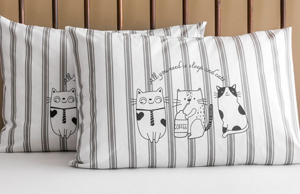 Gri renkli, çizgili desenli yastık kılıfı üzerinde eğlenceli kedi baskıları ve 'All you need is sleep and coffee' yazısı bulunmaktadır. 50X70 Cm boyutunda