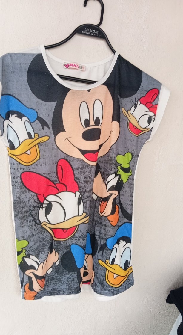 Gri renkli kız tişörtü, kısa kollu ve yuvarlak yakalıdır. Yumuşak sentetik kumaştan üretilmiş, bol kesim ve renkli çizgi film baskılarıyla süslenmiştir.