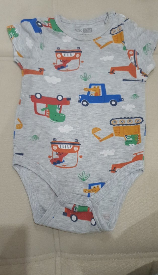 Gri renkli, kısa kollu ve bisiklet yakalı bebek body, renkli baskılı desenlere ve kolay giydirme için çıtçıtlı kapamaya sahiptir.