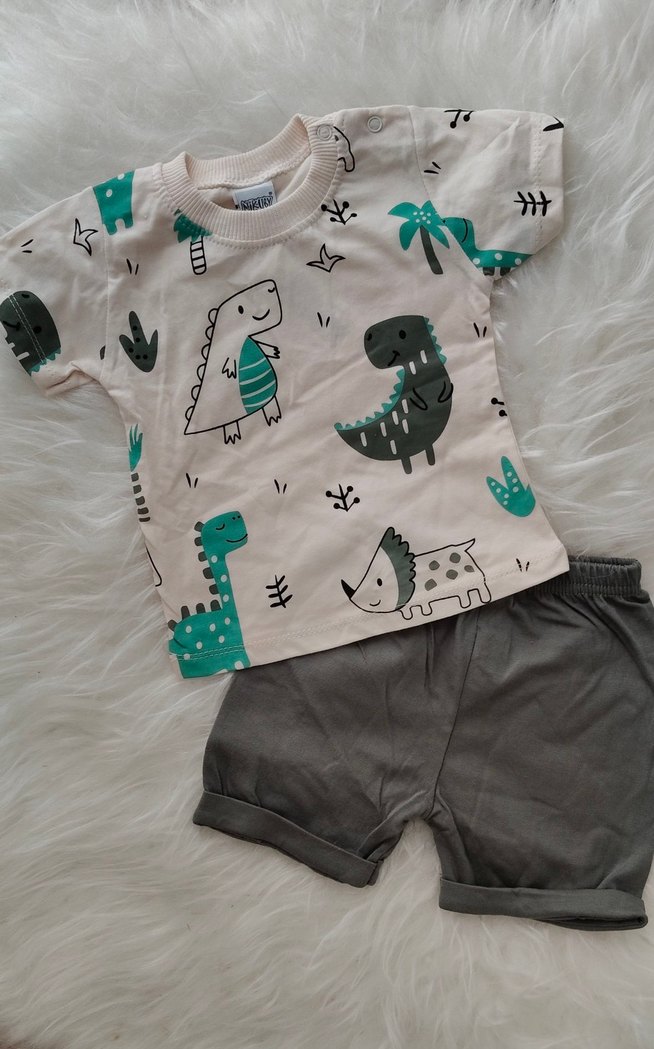 Yumuşak pamuk kumaştan, baskılı dinozor desenli kısa kollu tişört ve gri şortlu bebek takımı. 12-18 ay mevcut